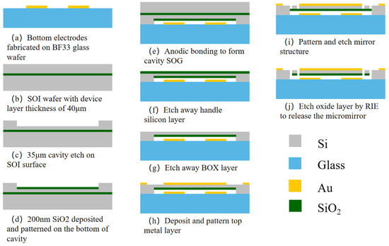 In this study, we aimed to investigate the effect of a SiO2 heat-dissipation layer on the etching of electrostatic torsional micromirrors. We fabricated two types of micromirrors using anode bonding, one with the heat-dissipation layer and the other without. For the micromirrors with the heat-dissipation layer, the fabrication sequence is shown in Figure 5. The specific micromirror fabrication process is as follows: