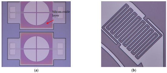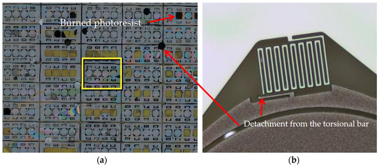 Fabricating electrostatic torsional micromirrors is a complex process that requires overcoming several challenges. One of the challenges is the accumulation of heat on the suspended mirror during continuous etching [15]. This issue can result in photoresist burning and deformation of the polymer in the photoresist, leading to poor etching results and structural damage. As can be seen from Figure 7a, for the micromirrors without the heat-dissipation layer—as in the previous analysis and simulation—a large proportion of the mirror structures crack, and the photoresist on the mirror surfaces is burned. In Figure 7b, it can be observed that the mirror has detached from the outer torsional bar. These observations suggest that the absence of a SiO2 heat-dissipation layer can lead to poor etching results, resulting in photoresist burning and structural damage to the mirrors. This can negatively impact the overall performance of the electrostatic torsional micromirrors and highlights the importance of utilizing a heat-dissipation layer in the fabrication process.