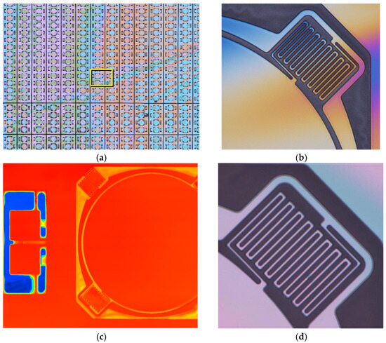 In the context of DRIE, it is common for the periphery of the wafer to undergo faster etching compared to the central region; consequently, an extension in etching duration is often necessary to ensure complete etching of the micromirrors uniformly across the entire wafer. However, when considering micromirrors integrated with a heat-dissipation layer, as depicted in Figure 8a, it is noteworthy that there is an absence of substantial photoresist burning, even when the micromirrors are over-etched; in addition, the enhanced etching outcomes are evident across the entire wafer. Figure 8c provides a comprehensive depiction of the micromirror’s post-deep silicon etching state using a profilometer for contour measurement. This analysis underscores the stability and structural integrity of the silicon dioxide layer, as evidenced by the absence of cracking or collapse, even after DRIE. Importantly, Figure 8b illustrates that the torsional bars remain unscathed, signifying that the addition of silicon oxide has proven effective in safeguarding the structural components. A subsequent insight from Figure 8d reveals the enduring integrity of the torsional bars and the successful release of the micromirrors, even after the removal of the silicon oxide layer through reactive ion etching (RIE). This outcome underscores the robustness of the integrated approach.