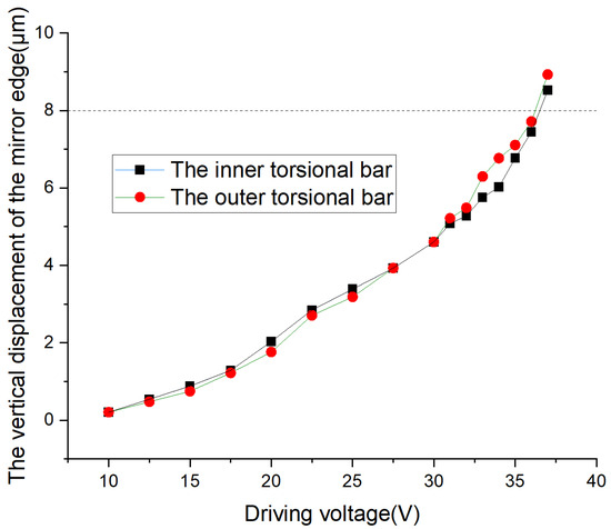 The experimental procedure involved directing a laser beam emitted from a laser source onto the center of the mirror’s surface. The initial position of the reflected laser beam on the receiving screen was recorded. By subsequently applying a predetermined driving voltage to the micromirror, a controlled angular deflection was induced. This angular displacement prompted a measurable shift in the point of laser beam reflection on the screen. This displacement corresponds to the vertical component of the mirror’s edge displacement caused by the mirror’s rotation. It allowed us to calculate the corresponding angular deflection. Figure 11 illustrates the results of the mechanical performance testing. Notably, the experimental results exhibit a strong alignment with the outcomes derived from simulations using finite element software, reinforcing the robustness and precision of our analysis.
