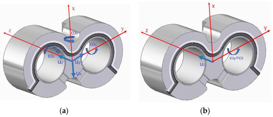 The leakage of the pump is related to the clearance between the gear and the FBB, among others, and that this is defined by the longitudinal displacement of the plate and its inclination, as shown in Figure 4. Looking at Figure 5a, we can see that the movement of the FBB is completely three-dimensional. The hydrostatic force pushes the bushing towards the gear with a velocity uz and at the same time towards the suction zone with a velocity ux. As this force is not centred on the centre of gravity, it is tilted with respect to the y-axis, so that the clearance between the bushing and the gear is a priori smaller in the pressure zone than in the suction zone. Moreover, as the radial forces on the shafts are asymmetrical, the bushing tends to move in the direction of the y-axis at a speed uy, just as it tilts with respect to the z-axis at an angular speed ωz. Finally, the pressure distribution in the gap between the gear and the bushing is not symmetrical with respect to the x-axis, so it tends to tilt with an angular velocity ωx. Modelling this motion is therefore particularly complex.