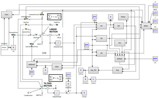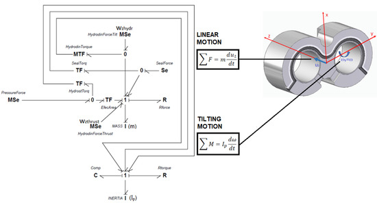 As far as the balance of torques is concerned, all the bonds of the lower node 1 share the flow variable, in this case the angular velocity, while the sum of all the efforts, in this case the acting torques, is equal to the product of the inertia with respect to the y-axis and the angular acceleration. It should be noted that all the torques are obtained by multiplying the forces by the distance from their centre of pressure to the axis passing through the bearing centres, operations carried out on the TF HydrostTorq, TF SealTorq and MTF HydrodinTorque transformers. The resistive torque due to the viscous friction between the bushing and the casing is represented by its own resistance Rtorque. Finally, a capacitive element C is considered to introduce into the system the tilting limitation due to the adjustment of the hydrodynamic bearings and shafts.