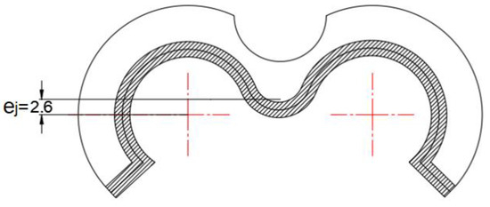 Figure 13b shows the effect of the dimensionless minimum thickness H0 on the dimensionless centre of pressure Xcp. It can be seen that for high dimensionless minimum thicknesses, i.e., with a wedge height reduced with respect to the minimum thickness, the centre of pressure is almost in the centre of the bearing. Translated to the case studied, if the bushing is slightly inclined, the tilting capacity of the oil film due to the hydrodynamic pressure generated as a plain bearing is minimal. The characteristic length of the equivalent bearing for calculating the centre of pressure is the outer diameter of the gear De.
