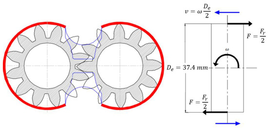 In Figure 1 the internal configuration of the reference EGP is shown. The FBBs are pressed against the gears by the outlet pressure acting on the rear area in red. In this way, the clearance between the gears and the FBBs decreases as the pressure increases, keeping the unit’s performance fairly high and constant. Lubrication studies in such complex domains are usually carried out using powerful CFD tools, with considerable computing equipment and very long simulation times. Examples include the work of Corvaglia et al. [4] on a three-dimensional model to measure pulsating flow, Thiagarajan et al. [5] on the effect of component surface roughness on lubrication, and Mithum et al. [6] on cavitation. A notable example of research on the complex interaction between fluid dynamics and the dynamics of the surrounding solid rigid under highly variable boundary conditions is the HYGESim software developed by Vacca and Guidetti [7].