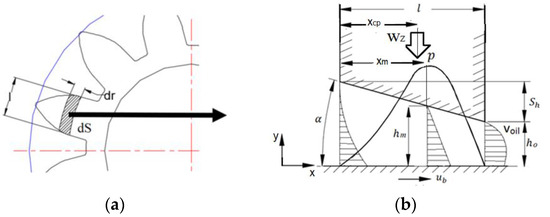 Looking at Figure 11a and taking into account an area differential dS of the flat side of the gear, the hydrodynamic pressure generated by the physical wedge is due to the relative speed with respect to the inclined side of the FBB. The calculation of the carrying capacity is obtained by integrating the product of the pressure and the area differential. Therefore, each dS can be treated as a sliding bearing between two flat surfaces with a relative inclination, as shown in Figure 11b. The lift force wz per unit width for a pad length l depends on the oil viscosity μ, the relative speed between the surfaces ub, the height of the wedge sh, and the minimum thickness h0. Then,