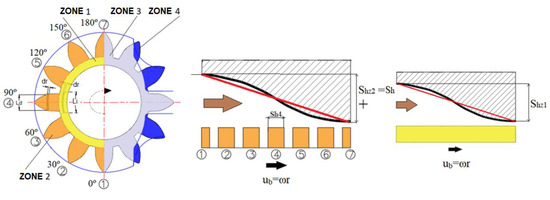 Assuming that the dimensionless force per unit length is uniform, Figure 14 shows different areas of the space between a gear and the side of the bushing. Zone 1, the annular surface between the shaft and the foot of the gear, and zone 2, the lateral surface of the teeth, contribute to the load carrying force because the surface of the gear moves in the convergent direction of the wedge. This does not happen in zone 3, which moves in a divergent direction, so it does not contribute to the load capacity, while in zone 4, located in the lateral grooves, there is no lubricating film. Not all the surfaces of zones 1 and 2 have the same inclination in the direction of speed, since near the impulsion and suction ports the relative speed of the gear is perpendicular to the direction of inclination, and therefore, no hydrodynamic pressure is generated. For example, teeth 1 and 7 do not generate any lift, while 4 generates the maximum load carrying force. In the drawing, the path of a surface differential dS in zone 1 and zone 2 is indicated with a black line, while the red line indicates the average inclination. The first behaves like a continuous bearing, while the second corresponds to a series of interlocking bearings.