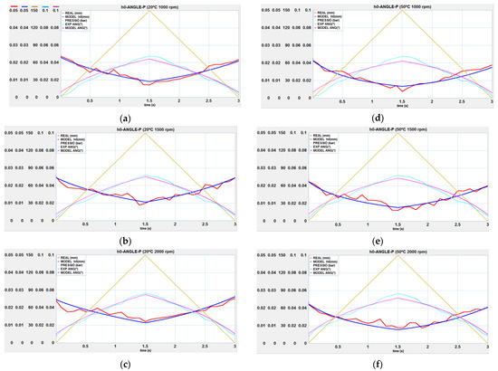 The goodness of the model is confirmed by the good correlation between the measured and simulated values of the thickness in different operating conditions. Furthermore, the results are comparable with those obtained by other authors, although it must be taken into account that the pumps are not always of the same size and that the same type of oil is not used. The order of magnitude of the minimum thickness is approximately the same (6–12 µm depending on the operating conditions), referring to the works of Borghi and Zardin [27] and Koç [9]. While in the work of Borgui and Zardin the FBB is inclined towards the suction side, in the experimental tests and the simulation of the reference pump of this research, the inclination is towards the impulsion side, as in the study of Koç. This is essential for the correct operation of the hydrodynamic wedge that forms the side face of the gears with the FBB, since a decrease in the thickness of the film in the direction of movement is necessary for a lifting force to appear, which does not happen if the FBB is poorly compensated and the inclination is towards the suction side.