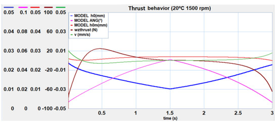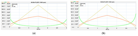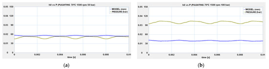For modelling, it is necessary to introduce two form factors. The thrust bearing form factor is basically geometrically justified and was left fixed in all the tests due to the lack of information to evaluate it. This lubrication mechanism operates only when there is a normal relative speed between the plate and the gear, so it does not affect the balance position. Figure 22 illustrates this behaviour, noting that at the beginning of the movement there is an approach of the centre of the FBB to the gear (h0m), at the same time as its inclination increases. Around the time of 1 s (50 bar), the position of the centre stabilises and the minimum thickness (h0) decreases due to the effect of the inclination. The FBB also tends to move its centre away from the gear as the inclination continues. From the time of 2.5 s (50 bar depressurized), the FBB loses its inclination by increasing the minimum thickness, but the mean thickness increases, creating a negative force that attaches the FBB to the gear. Therefore, the damping of the motion due to the thrust bearing behaviour occurs when there are pressure changes and these are not excessive, approximately below 100 bar. Above this pressure, the position of the FBB centre remains virtually constant and the minimum thickness varies only as a result of the change in slope. At high pressures, a very small thickness is not required because the inclination is greater, while at low pressures the FBB is almost parallel to the gear. This effect is perfectly illustrated by the evolution of the wedge height (Sh) and the dimensionless minimum thickness (H0) in the graphs of Figure 20.