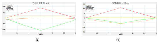 Once the minimum thickness has been reduced as the pump is pressurized, small variations in this will result in significant increases in the load carrying capacity. It should be noted that the minimum thickness and the force as a sliding bearing show a remarkable proportionality, which means that the equilibrium position is undoubtedly determined by the lubrication in the area considered. This is not the case for the tilting of the FBB, since the torque resulting from the displacement of the centre of pressure as a sliding bearing cannot compensate for the torque exerted by the hydrostatic forces, so the tilting must be limited by adjusting the shaft inside the journal bearings, whose rigidity is taken into account in the model by means of a capacitor. Approximately 60% of the tilting lift is exerted by the hydrodynamic force and 40% by the stiffness of the journal bearings. At pressures up to approximately 120–140 bar at 20 °C and 70–80 bar at 50 °C, the lifting moment exerted by the stiffness of the axles is greater than that exerted by the hydrodynamic force as a sliding bearing.