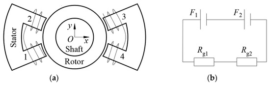 The model of AMB support characteristics is established by the equivalent magnetic circuit method. The structure of an eight-pole AMB in horizontal direction is illustrated in Figure 2a, where 1~4 represent the numbers of magnetic poles. Assuming that flux leakage, magnetic saturation, and magnetic coupling are neglected, the equivalent magnetic circuit for a pole-pair is provided in Figure 2b. The magnetomotive forces M1 and M2 of coils are