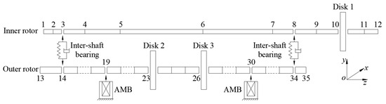 As depicted in Figure 4, the dual-rotor structure is discretized into 40 segments and 35 nodes, and 1~35 in Figure 4 are the node numbers. The discretized model consists of 33 beam elements, 3 disk elements, 2 AMB support elements and 2 inter-shaft bearing support elements. The Euler–Bernoulli beam element is adopted to consider moment of inertia and gyroscopic effect. For convenient analysis, disk elements are assumed as rigid, and inter-shaft elements are modeled as linear springs and viscous dampers.