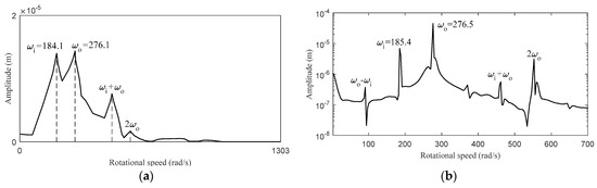 When fixed-point rubbing occurs, the response spectra diagrams of the dual-rotor system are shown in Figure 6. It is shown that the response spectrum mainly includes the rotating frequencies ωi and ωo of inner and outer rotors as well as their combined frequency components ωo+ωi and 2ωo. Hence, the simulation results are in good agreement with the experimental results. The variances of response amplitudes at these frequency components are caused by the differences in imbalance positions and initial conditions of the dual-rotor system. Therefore, the modeling method above is effective and the validity of the established dynamic model is verified.