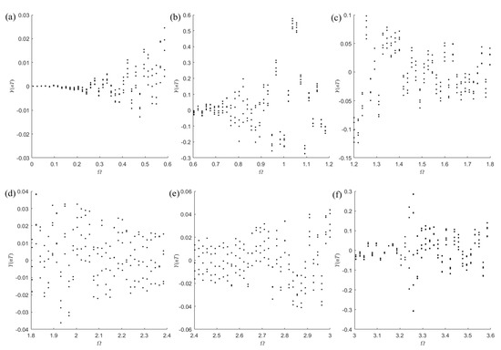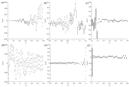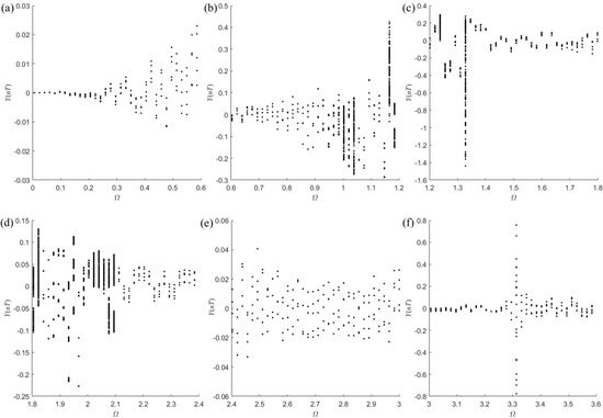 Bifurcation diagram of MSDS response with rubbing in counter-rotation r = −1.2. (a) 0.006 ≤ Ω ≤ 0.6, (b) 0.6 ≤ Ω ≤ 1.2, (c) 1.2 ≤ Ω ≤ 1.8, (d) 1.8 ≤ Ω ≤ 2.4, (e) 2.4 ≤ Ω ≤ 3.0, (f) 3.0 ≤ Ω ≤ 3.6.