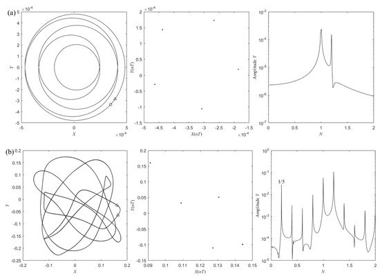 In the above nonlinear dynamic behaviors in co-rotation with r = 1.2, the high-order sub-synchronous motion of period 15 and period 20 are multiples of five, corresponding to the rotating frequency difference 1/5 with speed ratio r = 1.2. Under the combined actions of exponential order rubbing force, nonlinear electromagnetic force and unbalanced force, the fractional frequency components 1/15 and 1/20 are excited, which corresponds to 1/3 and 1/4 of the rotational frequency difference 1/5, respectively. Accordingly, in the spectrums in Figure 10b,c, the frequency components can be regularly expressed as multiple frequency components of 1/15 and 1/20, respectively. Even for the quasi-periodic and chaotic motions, the main frequency components in the spectrums can be expressed as a series of combined frequency components of the rotating frequency difference 1/5 and its fractional frequency component 1/25, as shown in Figure 10d,e. Therefore, the nonlinear vibration characteristics of MSDS are closely related to the speed ratio.