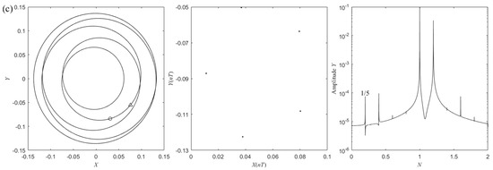 In the case of r = 1.2 without rubbing, the vibration of MSDS is mainly dominated by the dual-frequency unbalanced excitation of inner and outer rotors. More specifically, it is determined by the speed ratio and rotational frequency difference of inner and outer rotors. Taking Figure 8a as an example, there are two dimensionless frequency components of 1 and 1.2 in the spectrum, namely the dimensionless rotating frequencies of inner and outer rotors. In Figure 8b, the dimensionless rotating frequency difference 1/5 and its multiple frequency components also appear in the spectrum. The most likely cause of this phenomenon is the operation of MSDS near the first-order critical speed. As a result, the MSDS is dominated by the sub-synchronous vibration of period 5 without rubbing when the speed ratio is r = 1.2.