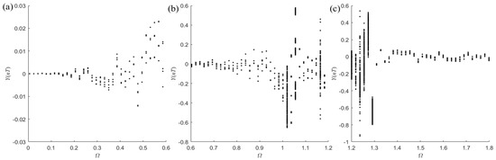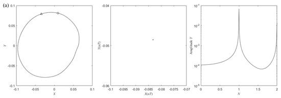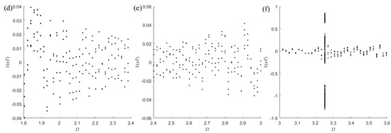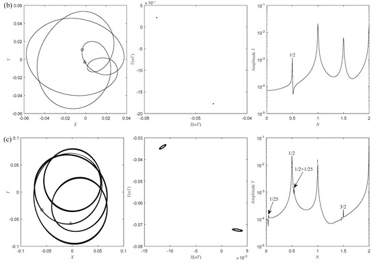 In the case of r = 1.2, the types of bifurcation for the inner rotor response without rubbing are examined with the increase of speed parameter Ω, and the corresponding bifurcation diagrams are generated in Figure 7. After careful inspection, each speed corresponds to five points, which indicates that the MSDS always performs the sub-synchronous vibration of period 5 over the full speed range. It should be noted that for some speed ranges, the number of points displayed is less than five due to multiple close response amplitude points at the speed shown in a larger scale figure, as shown in Figure 8a,c. In some intervals, the number of points for some rotational speeds is also less than five, while the corresponding Poincaré diagram shows that the number of points is still five. The reason is that displacements in the vertical direction that are intercepted by the bifurcation diagram at this moment are almost equal, as illustrated in Figure 8b. It should be noted that the dynamic trajectories in Figure 8, “○” and “△”, respectively, represent the positions of rotor center at a certain moment and the subsequent moment, according to which the change of the rotor whirling trajectory with time is demonstrated and the whirling direction of the rotor can be judged.