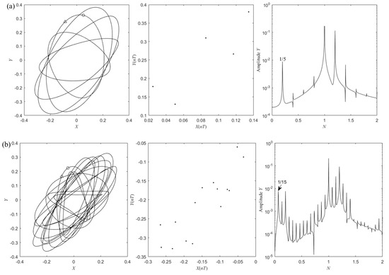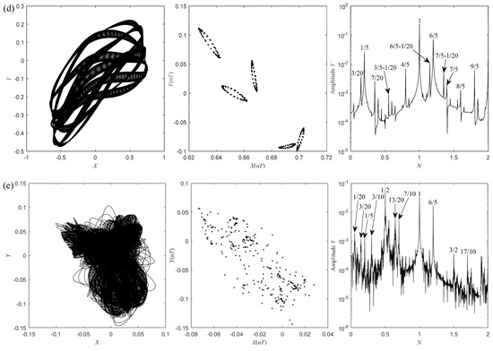 In order to have a deep insight into the above abundant nonlinear vibrations stimulated by rubbing, the dynamic responses of period 5, 15, 20, quasi-periodic and chaotic vibration at Ω = 1.008, Ω = 0.996, Ω = 0.984, Ω = 1.032 and Ω = 1.044 are depicted in Figure 10. It is easy to observe that the period n motion is characterized by n points in Poincaré maps, and the minimum dimensionless frequency component in the spectrum is 1/n. In addition, the response trajectory becomes more complicated with larger n, as shown in Figure 10a–c. When ghosting appears in the trajectory in Figure 10d, the Poincaré map is exhibited as five closed elliptic curves, and the frequency components with clear contours can still be observed in the spectrum, which infers that MSDS performs a quasi-periodic motion. Furthermore, chaotic motion occurs when the trajectory becomes chaotic, many irregular points exist in the Poincaré diagram, and dense burrs appear in the spectrum, as depicted in Figure 10e.