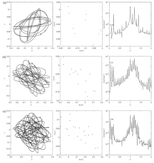 Trajectories, Poincaré maps and spectrograms of MSDS response in co-rotation with r = 1.2. (a) Period 5 motion with Ω = 0.096, (b) Period 5 motion with Ω = 1.090, (c) Period 5 motion with Ω = 3.549.