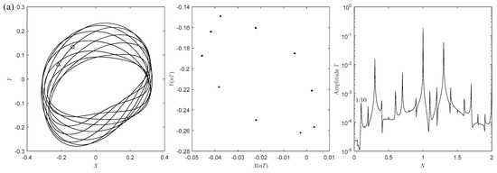 When the speed ratio is r = 1.3, the bifurcation diagrams of MSDS are illustrated in Figure 13. By careful examination, sub-synchronous motion of period 10 is found to be the fundamental motion that dominates the dynamic responses. n = 10 seems to correspond to the denominator of the rotational frequency difference 3/10. In addition, sub-synchronous motion of period 20, quasi-periodic and chaotic motion mainly occur in the ranges 1.104 ≤ Ω ≤ 1.593 and Ω = 3.006. The dynamic responses of various typical motions are shown in Figure 14. Similarly, for the sub-synchronous motion of period 10 and period 20 in Figure 14a,b, the basic frequency components are 1/10 and 1/20, respectively, and the other frequency components can be expressed as their multiple frequency components. In quasi-periodic motion with at 10 closed curves in Figure 14c, the main frequency component can be expressed as the multiples of basic frequency component 1/10.