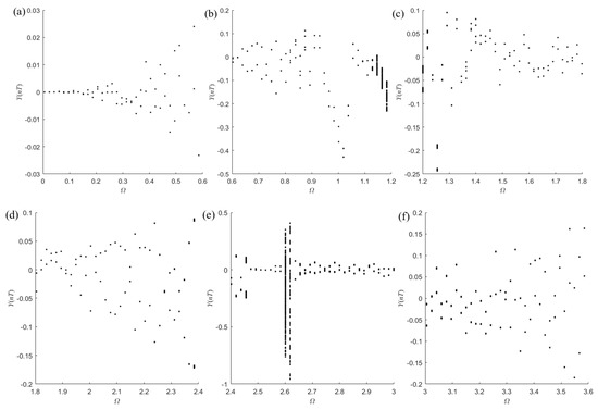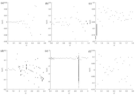 Bifurcation diagram of MSDS response with rubbing in co-rotation with r = 2. (a) 0.006 ≤ Ω ≤ 0.6, (b) 0.6 ≤ Ω ≤ 1.2, (c) 1.2 ≤ Ω ≤ 1.8, (d) 1.8 ≤ Ω ≤ 2.4, (e) 2.4 ≤ Ω ≤ 3.0, (f) 3.0 ≤ Ω ≤ 3.6.