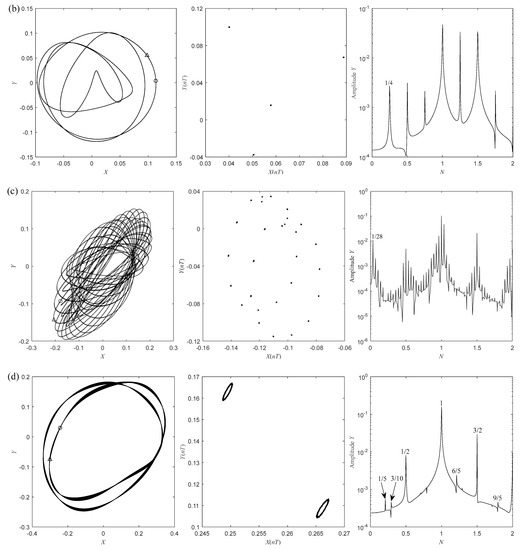 The bifurcation diagrams and corresponding typical dynamic responses of MSDS with speed ratio r = 1.5 are provided in Figure 15 and Figure 16, respectively. In this situation, the period 2 vibration dominates the whole speed range, where n = 2 is equal to the denominator of the rotational frequency difference ½. Quasi-periodic motion and chaotic motion exist in the ranges 1.129 ≤ Ω ≤ 1.255 and 2.384 ≤ Ω ≤ 2.619. A double period 4 motion at Ω = 0.845, multiple period 28 vibration at Ω = 1.213 and the quasi-period motion with two closed curves at Ω = 1.044 are demonstrated as typical examples of dynamic responses in Figure 16. The sub-synchronous motion of period n is characterized by n points in the Poincaré maps and the basic frequency component 1/n. The main frequency components of quasi-period motion may be expressed as the combination of rotational frequency difference 1/2 and its fractional frequency 1/10, for example, 1/5 = 2 × 1/10, 3/10 = 1/2 − 2 × 1/10, and so on.