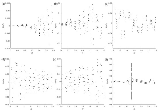 Bifurcation diagram of MSDS response with rubbing in co-rotation with r = 1.5. (a) 0.006 ≤ Ω ≤ 0.6, (b) 0.6 ≤ Ω ≤ 1.2, (c) 1.2 ≤ Ω ≤ 1.8, (d) 1.8 ≤ Ω ≤ 2.4, (e) 2.4 ≤ Ω ≤ 3.0, (f) 3.0 ≤ Ω ≤ 3.6.