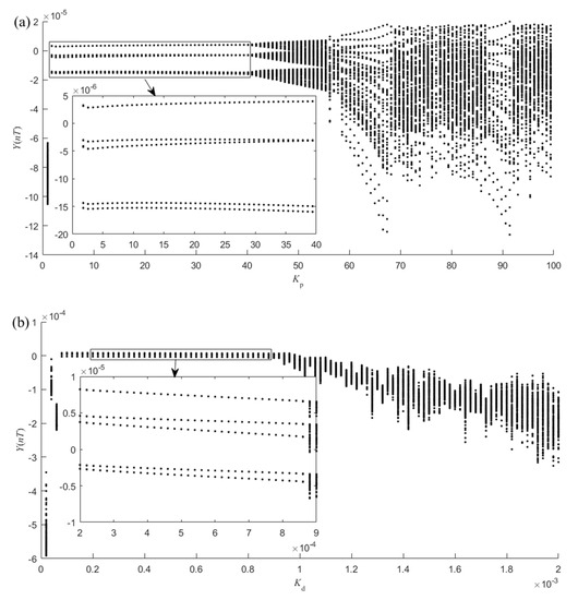 Bifurcation diagram of MSDS response with rubbing in co-rotation with r = 1.2 and ωi = 700 rad/s. (a) Proportional coefficient Kp, (b) Derivative coefficient Kd.