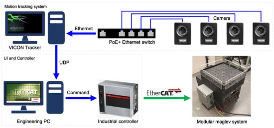 The system diagram is shown in Figure 2. Four five-megapixel cameras are placed at each corner above the system. The field of view is set to cover the entire area with a reference at the center of the coil array top surface. All cameras are connected to a switch with Power over Ethernet + (PoE+). These cameras are used to capture the reflective markers on the mover. The captured data are sent to the motion tracking software via Ethernet for mover pose computation. The mover pose is transmitted to the main controller to compute for control outputs. The current command outputs are assigned to the amplifiers via EtherCAT. EtherCAT is a high-speed communication protocol via a single cable. This protocol significantly simplifies the wiring from the controller to the amplifier units.
