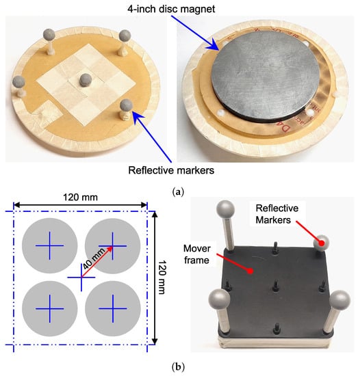 Next, the mover with multiple-disc magnets was designed to achieve 6-DOF motion. As shown in Figure 3b, the mover comprises four 2-inch disc magnets. The magnet is a Neodymium disc magnet grade N52 with remanence T. The magnet layout is optimized by considering three parameters: condition number, maximum current, and total power consumption. From the analysis, the layout with a diagonal distance of 40 mm was selected.