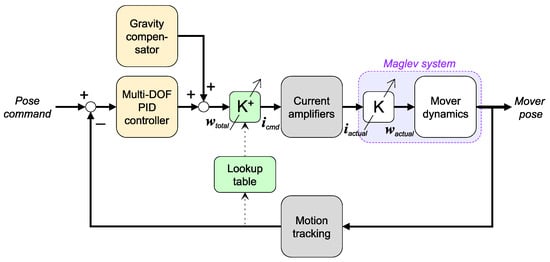 Figure 5 depicts an overall diagram of multi-DOF control for the planar maglev system. As mentioned in the system description, the mover motion is captured by the motion tracking system. The captured data are filtered and computed for the mover pose in the motion tracking software. Then, the mover pose and pose commands are fed to the multi-DOF controller to compute the controller commands.