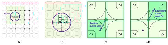 Since the lookup data are only precomputed for Q1, the equivalent pose (, ) of the mover from other quadrants is transformed to Q1 via