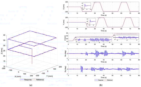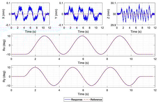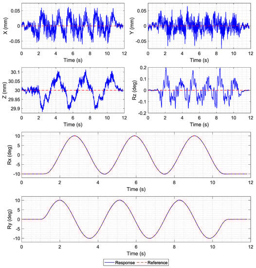 Then, the mover is rotated in place with roll and pitch angles of ±10 degrees, as shown in Figure 9. The trajectory tracking results in rotation demonstrate good tracking performance. However, the oscillations in the x, y, and z axes are ±0.07 mm. The cross-coupling effect between x–pitch and y–roll can still be observed in this experiment.