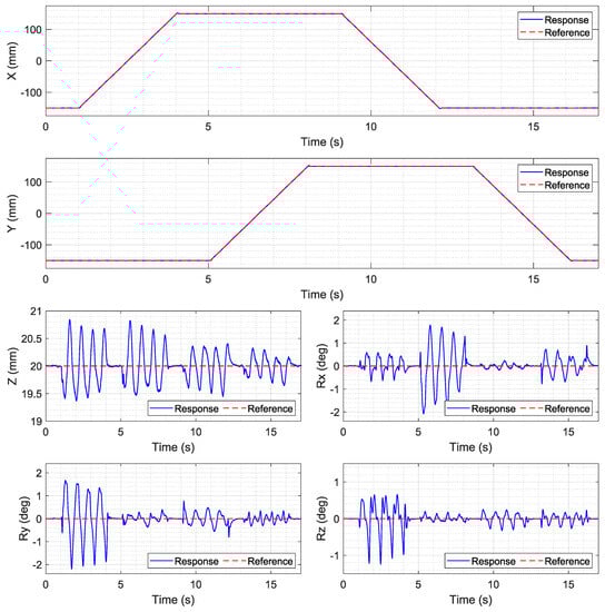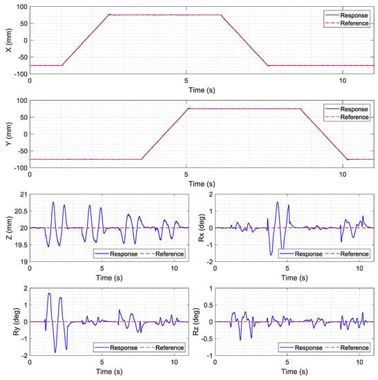The mover is rotated in place with ±10 degrees in both roll and pitch, as shown in Figure 12. The command tracking results demonstrate good tracking performance. The responses in other DOF are larger than those of the ramp command experiment. The errors in the x and y axes are ±0.06 mm, ±0.125 mm for the z axis, and ±0.2 deg for yaw rotation.