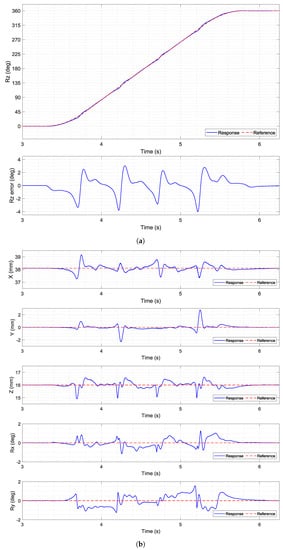 Meanwhile, large errors in other DOF during full-range yaw rotation can be observed in Figure 13b. In translation, several spikes occur in all axes periodically. For roll and pitch rotation, the error range is within ±1.5 degrees.