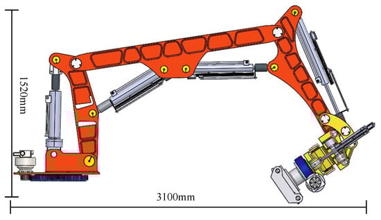 Efficient and quick rescue operations in the aftermath of natural disasters such as earthquakes and mudslides are a complex issue. Rescue equipment can be broadly categorized into two types: search and rescue. While the search type is used to locate trapped individuals, the rescue type is designed to perform tasks such as grasping, handling, and shearing that would otherwise require manual labor. Robots are increasingly being used for rescue operations to improve work flexibility and expand the range of operations. Over the past decades, different types of rescue robots have been developed, such as snake-shaped search and rescue robots [,,], bionic crawling search and rescue robots [,], wheel-footed robots with enhanced obstacle-crossing capabilities [,,], aircraft-based rescue robots [,], rope-assisted climbing robots for applications in mountainous environments [], and deformable robots for water rescue []. However, few of these robots have significant excavation and handling capabilities. Mitsubishi Heavy Industries developed a robot that could load 5 kg heavy objects and a robot that could load 10 kg heavy objects by adapting to a variety of environments, which are compact, flexible, and can enter narrow spaces []. Japan’s TMSUK developed the “Enryu T-53” []—a crawler-type double-robotic-arm robot with high load capacity and suitable for handling, capable of lifting 100 kg of weight with a single arm. Wolf et al. [] of Carnegie Mellon University developed a rescue robot with a wheeled motion platform and a multi-degree-of-freedom extension robotic arm, and the bottom moving platform expands the operating range of the robot. Shandong University, in cooperation with Luban Machinery Technology Corporation, developed a lightweight multifunctional dual-arm rescue robot with an overall weight of less than 5 tons, which can realize a variety of remote rescue functions [].