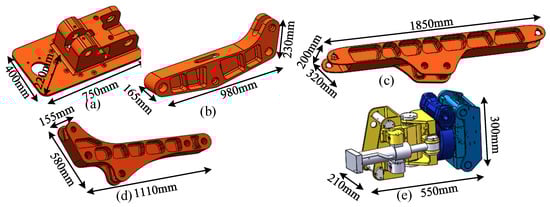 Aluminum alloy 7075 is the primary material utilized to meet the robotic arm’s high strength and lightweight criteria. However, compared with steel, aluminum alloy material performs far poorer when it comes to welding. As a result, none of the robotic arm’s arms are machined and no welding technology is used. The arm makes extensive use of carving and excavation to ensure lightweight. Figure 2 depicts the key parts of the robotic arm, with (a)–(e) standing for the base, primary arm, second arm, third arm, and end wrist.