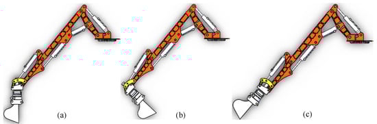 Dangerous posture of the robot arm under digging conditions. (a) Maximum depth attitude, (b) Maximum bending moment attitude, (c) Tooth tip and working arm co-linear attitude.