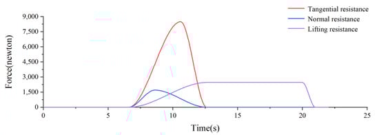 The main purpose of this simulation is to measure the force at the articulation point of each working arm, and the calculation and analysis found that the internal force of the wrist joint has almost no effect on the simulation results. Therefore, in order to simplify the operation, based on the ADAMS virtual prototype simulation model of the arm digging conditions, verified in the previous subsection, we use Boolean operations to combine the wrist joints into a whole. The tangential resistance gradually increases from 0 at 6.6 s, reaches the peak value of 8500 N after 4 s, and decreases to 0 after 2 s; the lifting resistance gradually increases from 0 at 6.6 s, reaches the maximum value of 2460 N after 6 s, and decreases rapidly at 20 s, and decreases to 0 after 1 s. Firstly, marker points are established at the position of the center of gravity of the bucket and the center point of the tooth tip, respectively, and the corresponding one-way force is added. The displacement driving function of each hydraulic cylinder and the change curve of the digging resistance are set by using STEP function, as shown in Table 2 and Figure 5.