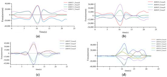 We set the simulation time to 22 s, step size 0.01, and ran the simulation. After the simulation, the force situation of each articulation point of the robot arm is viewed by the post-processing module. The load components of each joint’s articulation point in X-axis and Y-axis are shown in Figure 7, and (a) to (d) indicate the force of the articulation points of the base, large arm, second arm, and third arm joints, respectively.
