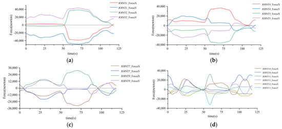 We set the simulation time to 118 s, and got the force change curve of each articulation point of the robot arm under the handling condition, where the load components of each joint’s articulation point in X-axis and Y-axis are shown in Figure 9, and (a) to (d) indicate the force of the articulation points of the base, large arm, second arm, and third arm joints, respectively.