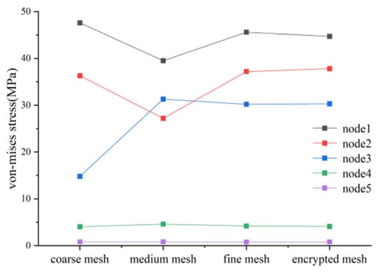 Although the seven-degrees-of-freedom redundant rescue robot arm designed in this topic is completed in Solidworks, the overall structure is more complex. Considering the aesthetic appearance of the robot arm and the requirements of some parts’ processing characteristics, many features such as rounded corners, small holes, chamfers, and tabs are retained at the early stage of structural design, and if these features are not simplified, stress singularities will be easily generated during analysis, which will lead to a large difference between the analysis results and the real value, and even the failure of the mesh division and the crash of the solver. Therefore, before the analysis, the analysis object should be reasonably simplified, the insignificant geometric features compressed or removed, and the reinforcement retained. Rounded corners and other geometric features have a greater impact on the calculation results, and special attention must be paid to the location where the analysis object is very likely to produce stress concentration to reduce the impact of stress concentration. The stress results of different nodes of the base at different mesh densities are shown in Figure 10. Therefore, when carrying out the mesh division, the region with greater influence on the analysis results uses the mesh control function to refine the mesh, and the quality should be high. When carrying out pre-processing work, it is necessary to ensure that the stiffness of the finite element analysis model before and after simplification is consistent; otherwise, it is likely to lead to a large difference between the analysis results and the actual value. The results of the mesh division of the three arms, two arms, large arm, and base are shown in Figure 11a–d, respectively.