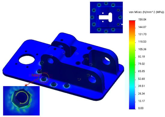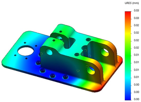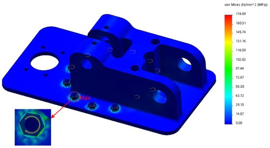 The parts of the base with large stress variation and stress maximum are shown in Figure 20. The maximum stress appears at the bolt hole, and the stress maximum is 174.89 MPa, which is much smaller than the stress limit of 505 MPa. From the deformation cloud shown in Figure 21, it can be seen that the maximum deformation of the base is only 0.03 mm; the deformation is very small, which means that the base is relatively safe under stress.