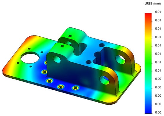 The parts of the base with large stress changes and stress maxima are shown in Figure 12. The maximum stress appears at the bolt hole; the stress maxima is 158.04 MPa, far less than the stress limit 505 MPa. According to the stress cloud diagram, it can be seen that the overall stress on the base is small, and it is only at the bolt hole that a larger stress appears. From the deformation cloud shown in Figure 13, it can be seen that the maximum deformation of the base is only 0.01 mm; the deformation is very small, which means that the base is relatively safe under stress.