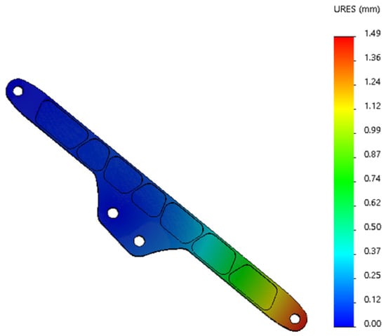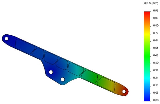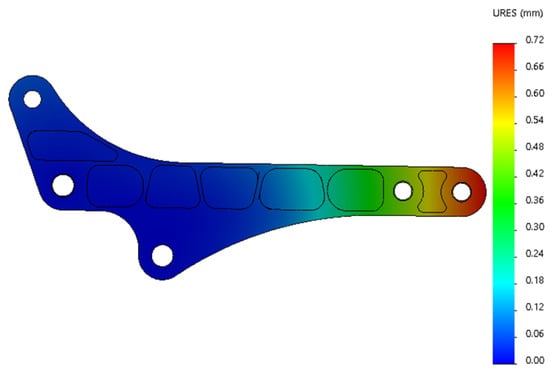 The parts of the second arm where the stress changes more and the stress maximum are shown in Figure 16. The maximum stress appears at the articulation hole linked with the big arm. The stress maximum is 47.82 MPa, much less than the stress limit 505 MPa. According to the stress cloud diagram, the stress at the middle reinforcement of the second arm, the articulation hole, and the stress at the back is larger. The maximum position of deformation appears at the end of the second arm and the three arms’ articulated shaft hole ear plate, as shown in Figure 17. The maximum value of deformation is 0.96 mm, and close to the robot arm base direction, the deformation is relatively small.