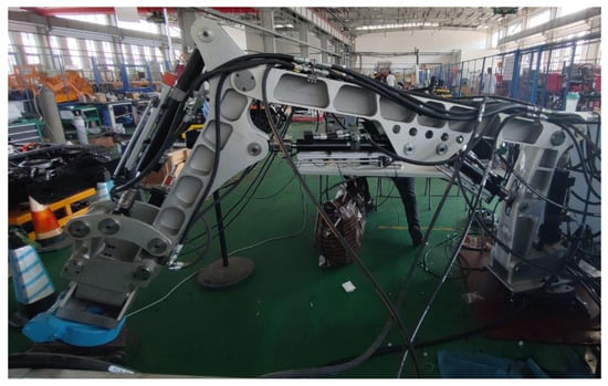 It has been established through finite element analysis and dynamic simulation that the designed structure satisfies the necessary strength standards. Based on the planned robotic arm concept, a hydraulic robotic arm prototype is made and shown in Figure 28. The oil cylinder and hydraulic motor, which serve as the robotic arm’s drive units, both have displacement sensors, setting the groundwork for eventual displacement closed-loop control. The hydraulic flow rate of each of the robotic arm’s driving components is managed by a number of hydraulic proportional directional valves.