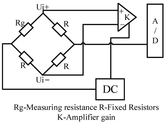 (2) Measuring bridge design and principle: A simple and reliable 1/4 bridge was used for the bridges, where each strain flower needs to be connected to three bridges, and the measuring bridge principle is shown in Figure 32 below.