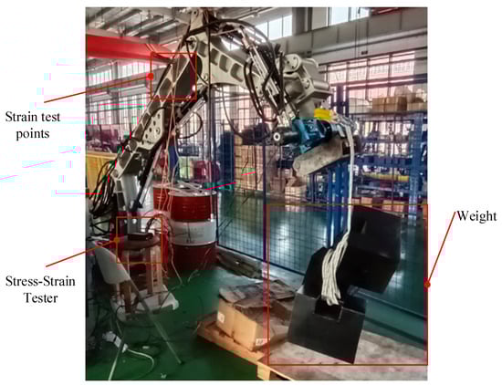 The finite element method is widely used in structural design optimization, but the structural model is simplified for the sake of calculation simplicity, there are some differences with the actual structure and process, and the boundary conditions are set differently from the actual one. Therefore, the correctness of the finite element model is tested by the test results and, the smaller the error, the closer it is to the actual one. In this section, based on the completed FEM analysis, the stress–strain test is conducted on the robot arm to verify the feasibility of the finite element model.