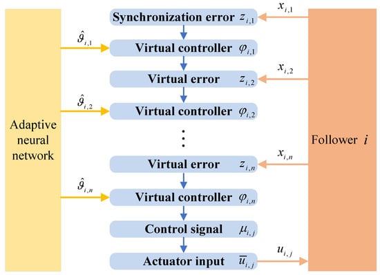 where and , respectively, denote the synchronization error and virtual error of the i-th agent, represents the virtual controller.