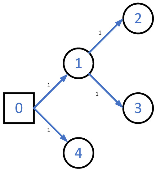 Consider a class of MASs with a communication structure as presented in Figure 2, where node 0 represents the leader, and 1–4 represent the followers. The model for each follower is given below.
