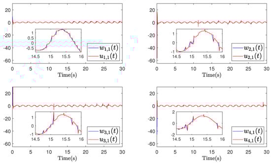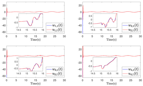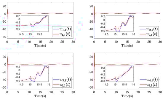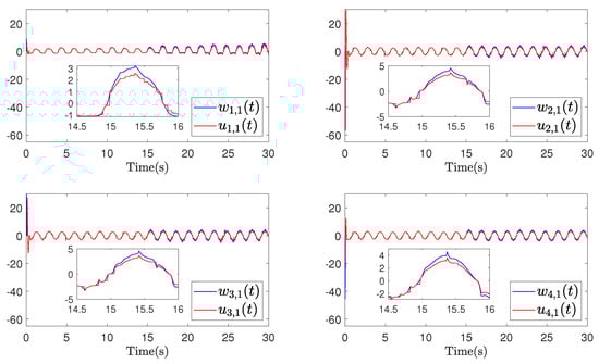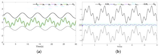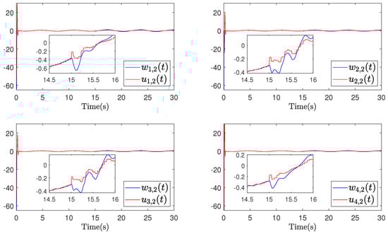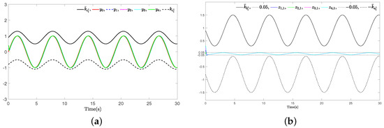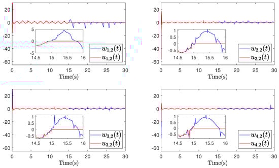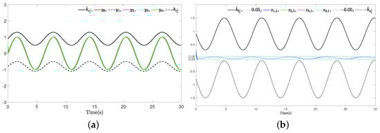 where , the selection of the nonlinear functions are , and . The system’s constraint functions and the leader’s signal are chosen as , , , and , respectively. The other system parameters and controller parameters are listed in Table 1.